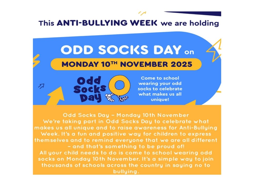 Odd Socks Day – Monday 10th November: Children are invited to wear odd socks to celebrate what makes us all unique. No need to buy anything new – it’s a fun way to start conversations about individuality and acceptance.